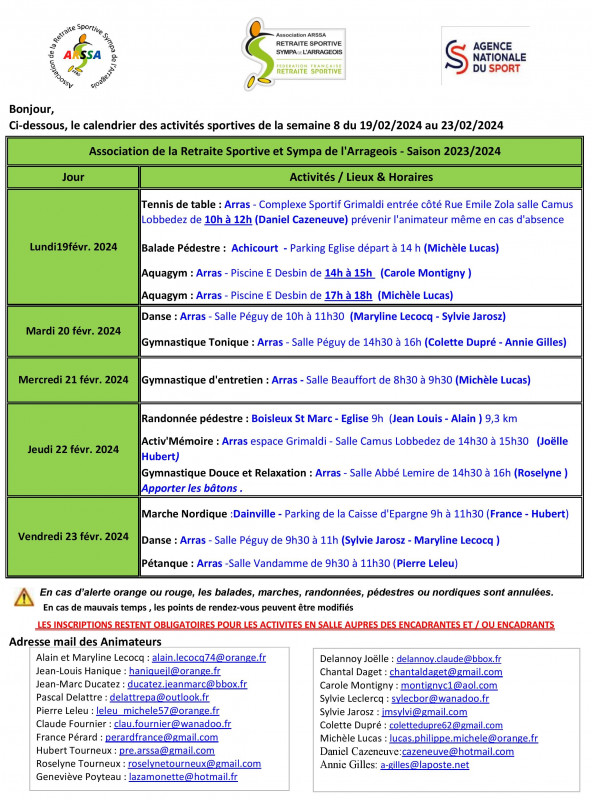 Planning du 19 au 23 février 2024