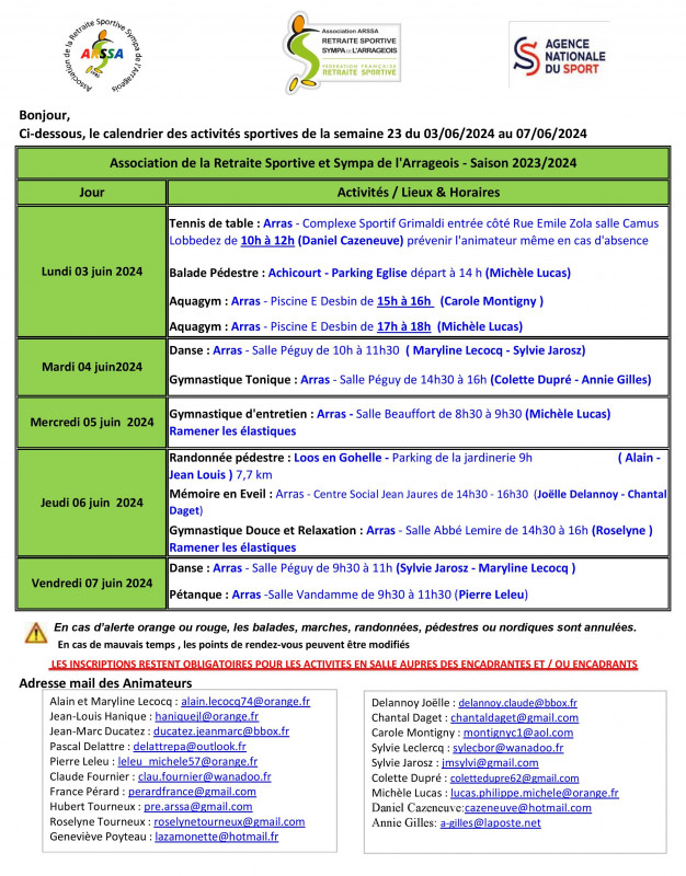 Planning du 03 juin 07 juin 2024